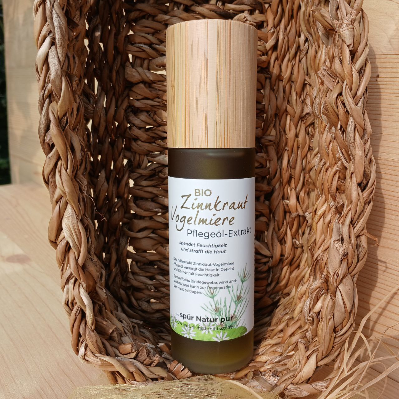Zinnkraut Vogelmiere Pflege Öl Extrakt in Bio Olivenöl, duftet arttypisch krautig. Es versorgt deine Haut in Gesicht und Körper mit Feuchtigkeit, durch den hohen Anteil an Kieselsäure kann es unterstützend bindegewebsstraffend, Antioxidativ und anregend für die Zellneubildung wirken.