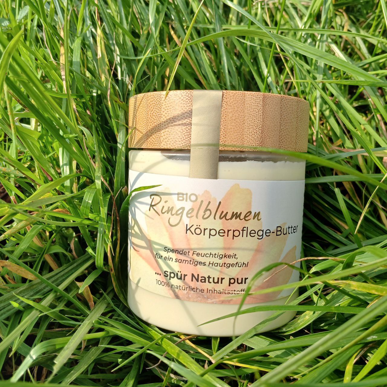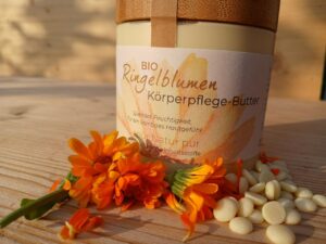 Ringelblumen Körperpflege Butter duftet beerig-fruchtig mit seinen gehaltvollen Inhaltsstoffen wie Ringelblumen Pflege Öl Extrakt, Sheabutter, Kakaobutter und Jasminwachs, spendet es deiner Haut Feuchtigkeit, ist schützend und regeneriert. Sorgt für ein samtig weiches Hautgefühl. Für deine tägliche Anwendung, nach dem Duschen oder Baden auf deinen Körper auftragen.