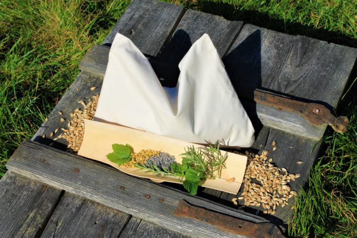 Füllung: Dinkelspelze gereinigt, Pfefferminze, Kamille, Zitronenmelisse, Lavendel und Rosmarin aus heimischer Landwirtschaft.